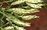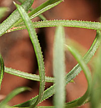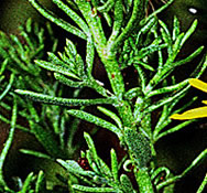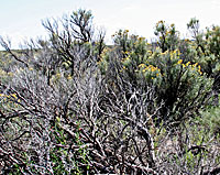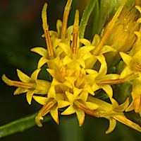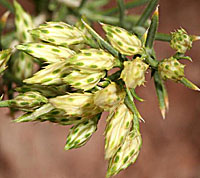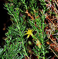 | Green Rabbitbrush is distinguished by the sticky foliage and corkscrew leaves. This specimen was photographed in meadows along Taylor Creek above Almont, Colorado at an elevation of 8,400 feet on July 1, 2007. Height 21 in. to a meter. Lower stems are woody, upper stems greenish. Leaves twisted, length 40 mm, width 3 mm, clearly five nerved with center nerve prominent. |