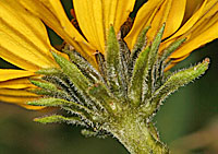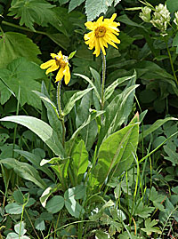 Aspen Sunflower growingmeadows at Rocky Mountain Biological Laboratory, Gothic, Colorado, 9,500 Feet, July 20, 2007. Height is 79 cm, leaves are basal and stem, basal length 150 mm, width 44 mm,petiole 95 mm. Lower stem leaves are opposie, upper are alternate, lower length137 mm, width 40 mm. Flower heads are 63 mm wide with 30 mm rays. Flower head length is 30 mm. The heads orient parallel to the ground.The meadow slopes to the West with good exposure to western sun. Nearby flora include helianthum hoopesi and cirsium scariosum. Above the meadow is a plant community dominated by Populus tremuloides. |