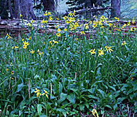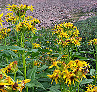 | Sawtooth Senecio, Senecio serra (toothed), growing in a marshy area near an alpine stream, elevaton 11,800 feet, Continental Divide Trail north of Pagosa Springs, Colorado. This is a sunny, south facing slope near timberline with occasional groves of Picea engelmanii. | |||||