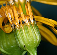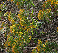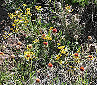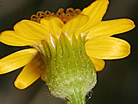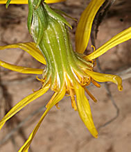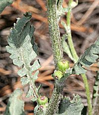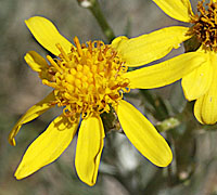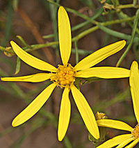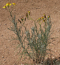 | Many headed Groundsel, Senecio spartioides, growing adjacent to an arroyo near West Pawnee Butte, Pawnee National Grazeland, Colorado, at an elevation of 5,250 feet. Substrate is sandy. Plant height is 25 cm, leaves are stem, alternate, length 60 cm, width 1.5 mm, no petiole. Flower width is 39 mm with seven or eight 19 mm rays. | |||||