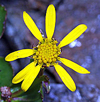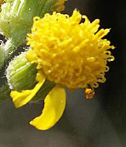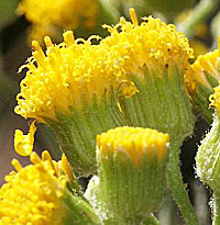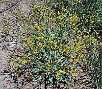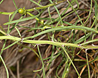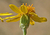 Mohave Ragwort, Senecio mohavensis, growing on a sandy bench in Mosaic Canyon, Death Valley, California, 1,520 Feet, March 16, 2007. Curious appearance with tiny yellow flowers and clasping leaves, at first do not realize its a composite or a Senecio. Plant 14 cm. leaves alternate, basesclasping, |