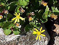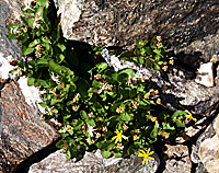 | Colorado Ragwort, Senecio soldanella (small coin), growing on a south facing talus slope above Kite Lake, Colorado, elevation 13,000 feet. | |||||