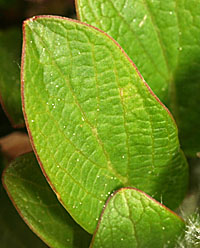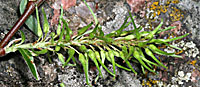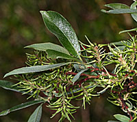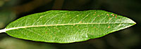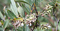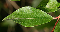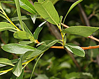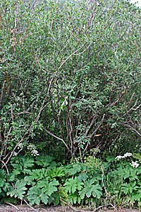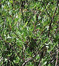 | Salix planifolia, Diamondleaf Willow, shore of Summit Lake, northwest of Crested Butte, Colorado, elevation 10,400 feet, July 26, 2006. Common along lakeshore. Height is about 1 meter, upper twigs reddish, lower shading to grey. Leaves are alternate, length 38 mm. width and smooth above and below. A few catkins remain. | |||||