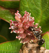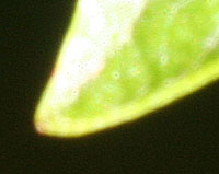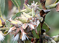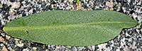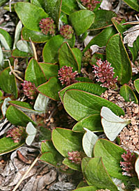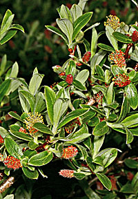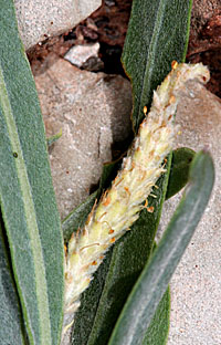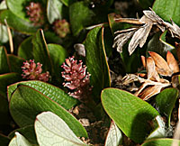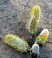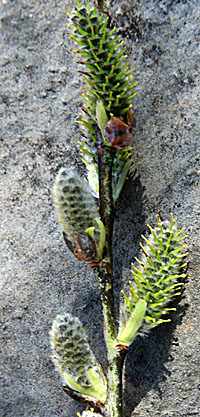 Snow Willow, Salix nivalis, growing on alpine tundra on Pikes Peak, Colorado, elevation 12,900 Feet, June 16, 2007. Plant height is 15 mm. , leaf length is 15 mm, leaf width 7 mm, inflorescence (male) width 4 mm. This is a dwarf willow of alpine tundra. |