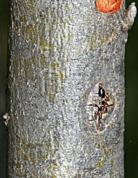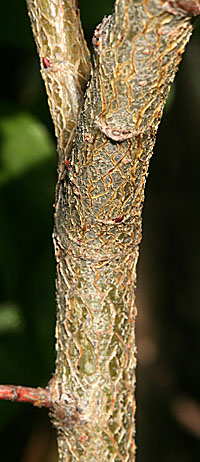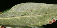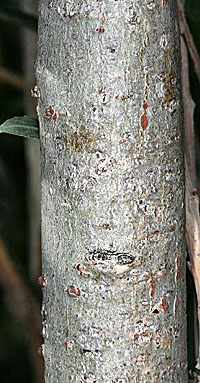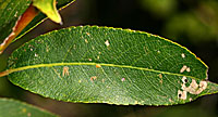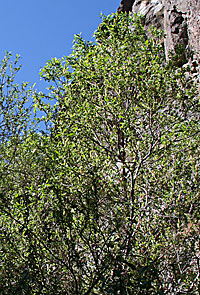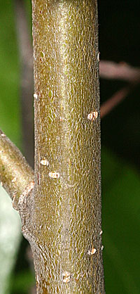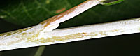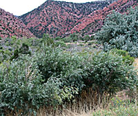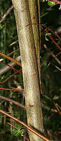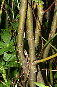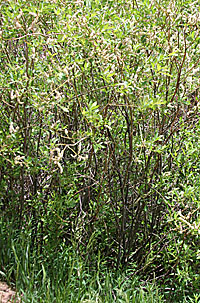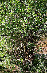 | Bebb Willow, Salix bebbiana, growing next to stream at Granite Campground,Taylor creek just upstream of Almont, Colorado, elevation 8,400 feet, July 23, 2007. Trunks all in a bunch. height 4 meters. twigs red, stems gray, trunksgreenish yellow. leaves alt l 45 mm, w 21 mm. Small red gland at leaf tips. | |||||