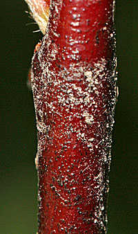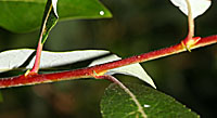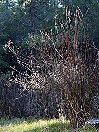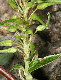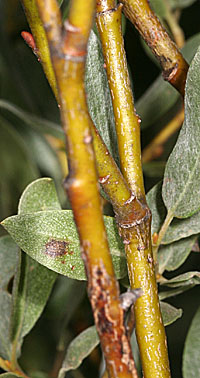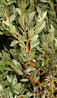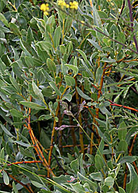 | Wolf Willow, Salix wolfii, growing in a marshy meadow at Rocky Mountain Biological Laboratory, Gothic, Colorado, elevation 9,400 Feet, July 21, 2007. A short willow with reddish orange trunks. Twigs yellow orange, midsized stems yellow orange, lower bark gray green. Height is 1 meter, leaves alternate, length 38 mm, width 19 mm. | |||||
