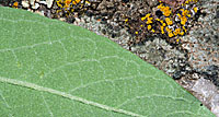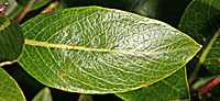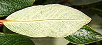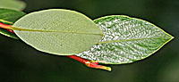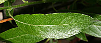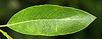 | Blue willow, Salix drummondiana, growing where a small stream crosses a road in Gothic, Colorado, elevation 9,400 Feet, July 22, 2007. This is a larger willow, height 4 meters, trunk to 4.5 cm diameter, leaf length 70 mm, width 35 mm. Green twigs have glacous bloom. Stems are greenish yellow, trunks grey. Leaves bright green on top with felty hairs on the bottom. | |||||