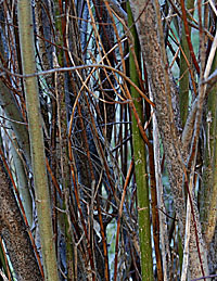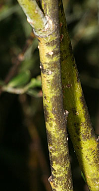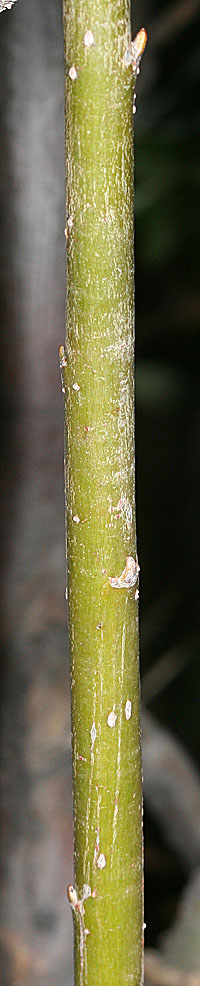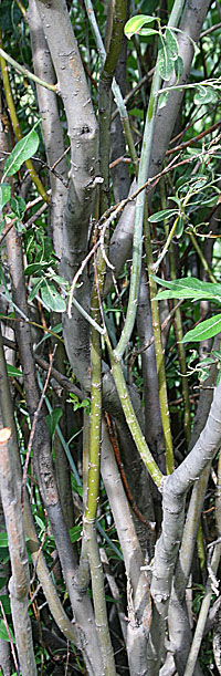 | Salix lucida, a streamside willow growing on Taylor Creek upstream from Almont, Colorado, elevation 10,400 Feet, July 7, 2007. Bark is distinctly yellow green,height at least 9 feet, leaves alternate length 105 mm, width 34 mm, catkins 50 mm long, 14 mm wide. New growth 80 mm not including leaf length. Bark color ranges from greenish yellow on twigs to greenish yellow on stems to gray with a touch of greenish yellow on trunks. | |||||