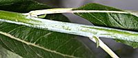 | Bluestem Willow, Salix irrorata, growing by Tajique Campground, elevation 6,800 Feet, east side of the Manzano Mountains, New Mexico. Growing adjacent to the stream by the campground on March 29, 2007. Many stems, height is ten to twelve feet, old leaves, with 6 mm pediole, length 72 mm, width < 10mm, leaves alternate, catkins appearing but no new leaves yet, female catkins green and fuzzy, length 15mm, width 6 mm, male catkins length 21 mm, w 9mm. | |||||