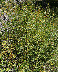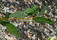 | Yellow Willow, Salix lutea, gwowing low on a south facing slope at the headwaters of Monument Creek, Rampart Range, west of Colorado Springs, Colorado, elevation 9,200 feet, September 3, 2007. Growing in a warm microclimate adjacent to granite boulder at the north edge of the marsh with clear southern exposure. Height is 2.1 meters, twigs orange, stems gray green, trunk gray, stem leaves alternate length 50 mm, width 20 mm. | |||||